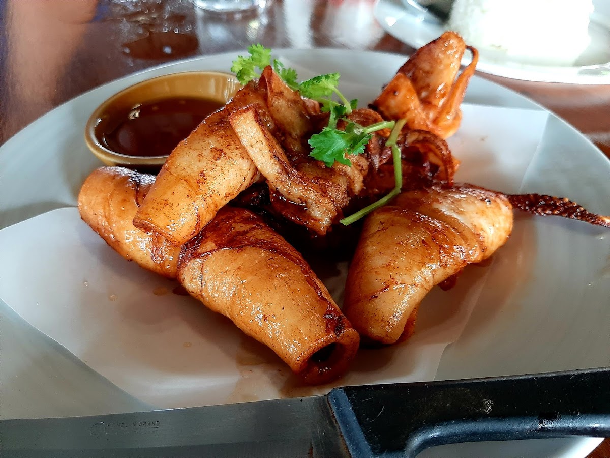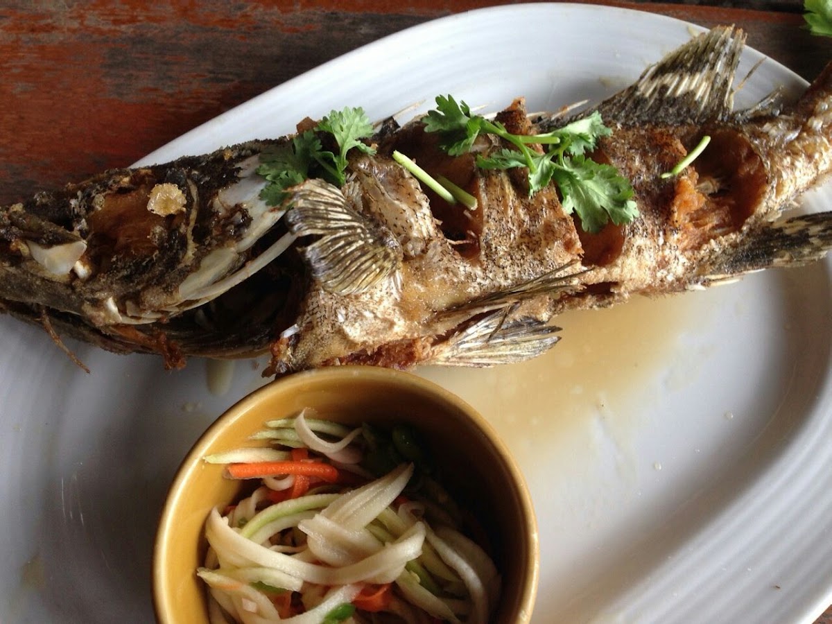 We were recommend by the staff to have the deep fried snapper with three flavoured sauces, it was delicious, pretty spicy for us but still very good. Beautiful setting and very relaxing. Would love to be staying in the villas here.